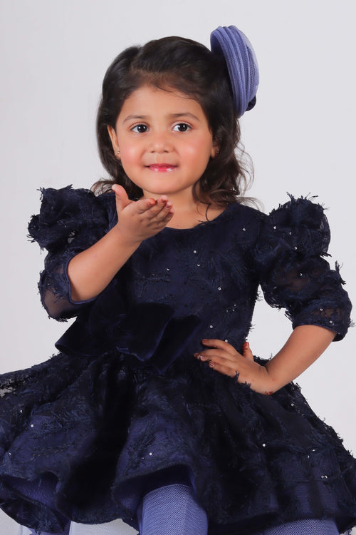 Elegant Navy Blue Fabric: The outfit is crafted from a rich navy blue fabric that exudes sophistication and elegance, perfect for making a statement at any occasion. Charming Bow Detail: The skirt is adorned with a delightful bow at the waist, adding a playful and...