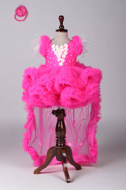 Color: Vibrant fuchsia pink that radiates fun and festivity.Design: Embellished with floral appliqué and dainty pearls on the bodice, complemented by feathered shoulder accents for added drama.Skirt: Layered and voluminous, with ruffled tulle creating a princess-like puff.Accessory: Paired with a matching fuchsia headband, complete with...
