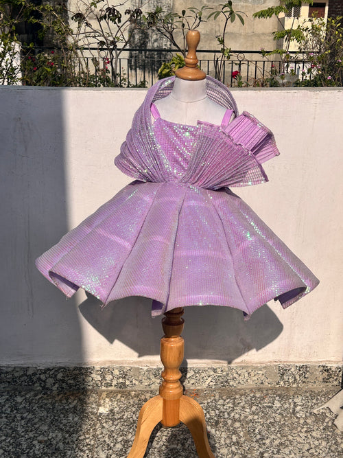 DETAILS: Lavender shiny net dress with frills, perfect for kids' parties and birthdays. Stylish bodice with half sleeves adds elegance and comfort. Ideal for mom-daughter twinning moments, enhancing beauty. Enchanting choice for any occasion, exuding charm and grace. Elevate your little one's wardrobe with this...