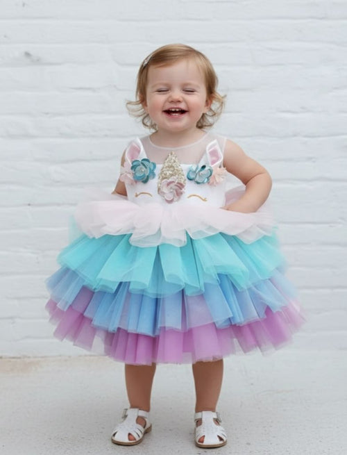 DETAILS: Beautiful multi colored dress Embellishment of flower motifs on bodice The bottom features multiple layers of frills Satin lining Sleeveless Headpiece included Color can be customize PRE ORDER & CUSTOM: Pre orders and custom orders take on average 3-4 weeks to prepare and ship...