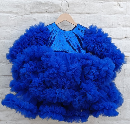 DETAILS: Beautiful fluffy blue frock designed for special occasions. Features a stunning sequins blue fabric bodice that adds sparkle. Delicate trills on sleeves enhance the frock's elegance. Ideal as a party wear dress, perfect for celebrations. Makes a perfect birthday dress for memorable moments. Designer...