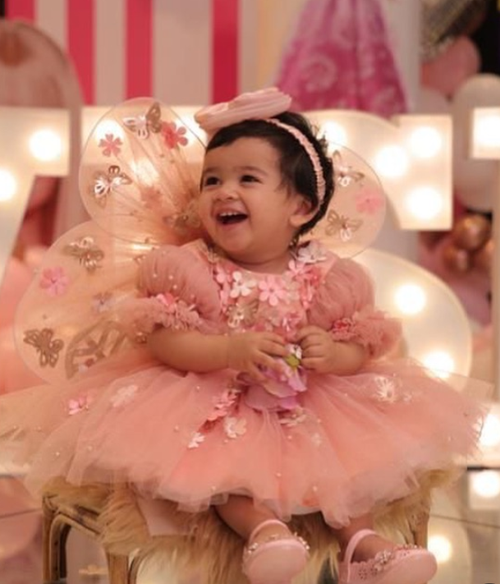 DETAILS: Peach fluffy net dress adorned with butterfly and floral embellishments Perfect for birthdays and luxurious kids' parties Beautiful wings add an enchanting touch to the ensemble Exudes elegance and charm, ideal for special occasions A stunning choice for creating memorable moments in style Satin...