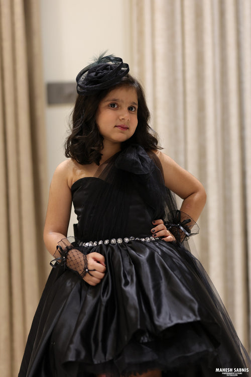 Details: Color: The dress is a sophisticated black. Design: It features a one-shoulder design with a tulle overlay, creating a dramatic and elegant look. Silhouette: The dress has a high-low hemline, shorter in the front and longer in the back, adding a fashionable and trendy...