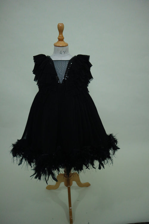 Details: Color: Elegant black Design: Ruffled layers on the bodice Neckline: V-neck with sequin accents Skirt: Flared with feather trim at the hem Material: Lightweight, likely chiffon or similar fabric Style: Suitable for formal occasions or special events Details: Intricate detailing with a combination of...