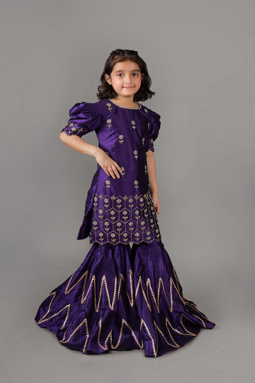 purple embroided kurti pai Elevate your style with our exquisite purple embroided kurti, featuring elegant balloon sleeves. Paired with a matching sharara for a luxurious and sophisticated look. Perfect for special occasions or everyday glamour. Crafted with care for the discerning fashionista. Wash care Dry...