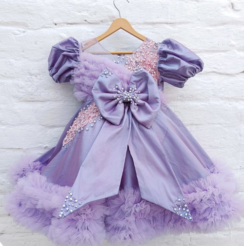 DETAILS: Beautiful net dress Bodice adorned with mirrors Delicate trills on flares and armholes Matching back bow enhance the look Satin lining Sleeveless Headpiece included Color can be customize PRE ORDER & CUSTOM: Pre orders and custom orders take on average 3-4 weeks to prepare...