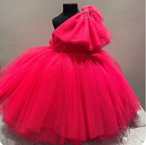DETAILS: Beautiful hot pink dress Bow at shoulder Rhinestones at shoulders Ball gown style Satin lining Sleeveless Headpiece included True to size or size up if child is in between size Color can be customize PRE ORDER & CUSTOM: Pre orders and custom orders take...