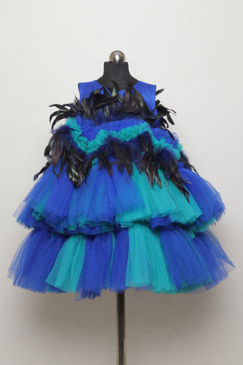 DETAILS: Charming blue frills dress Prettify with feathers Complemented by matching headband Back bow enhance the look Cotton lining Sleeveless Headpiece not included True to size or size up if child is in between sizes Color may vary due to lighting on images PRE ORDER...