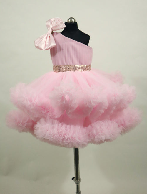 DETAILS: Pink one shoulder dress Bow on one shoulder Trills on the bottom hem Back bow enhance the look Satin lining Knee length Headpiece included Color can be customize PRE ORDER & CUSTOM: Pre orders and custom orders take on average 3-4 weeks to prepare...