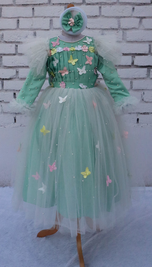 DETAILS: Beautiful net dress Garnish with 3D flowers and butterfly Armholes adorned with net frills Matching stuffed bow on back enhance the look Ankle-length Full sleeves Satin lining Headpiece included Color can be customizePRE ORDER & CUSTOM: Pre orders and custom orders take on average...