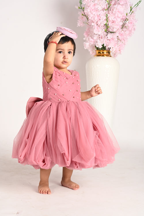 Details: Color: Soft rose pink. Design: Sleeveless bodice with an elegant, criss-cross pattern adorned with pearl embellishments. Skirt: Voluminous tulle skirt with gathered detailing, adding a touch of whimsy and flair. Back: Features a large, stylish bow at the back, enhancing the overall charm. Material:...