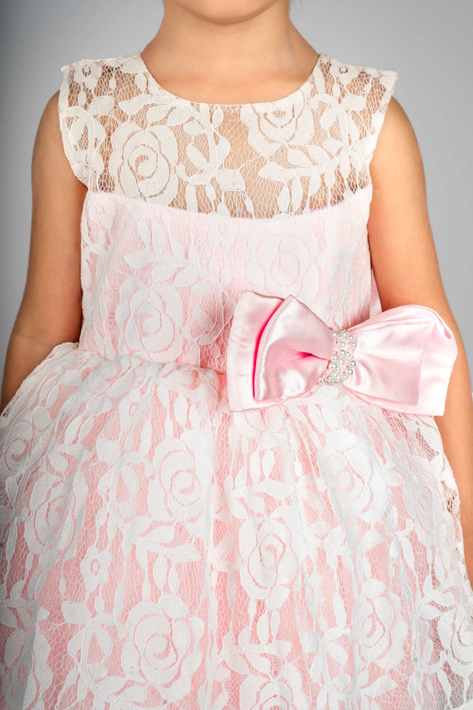 This elegant lace frock features delicate pearl embellishments on the front and a charming bow at the back, blending sophisticated style with comfort. Perfectly suited for both casual outings and premium occasions, its timeless design ensures a graceful look wherever worn.