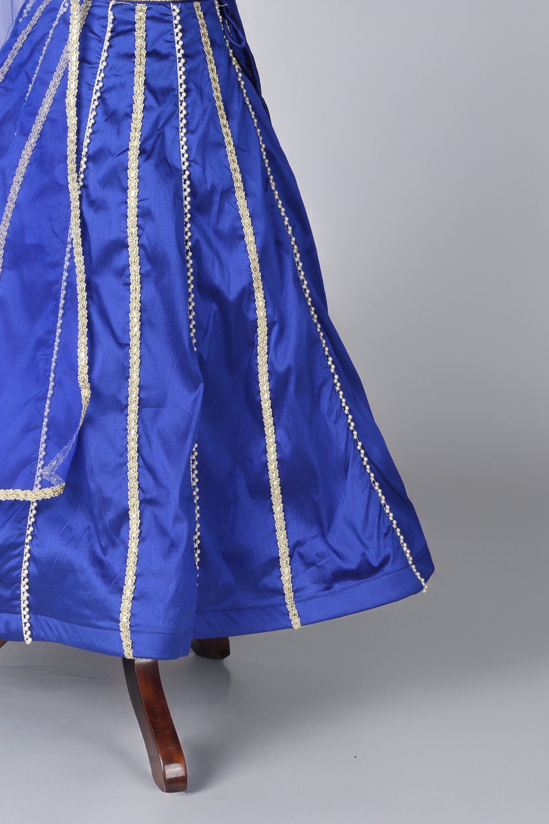 Color: Deep royal blue, exuding an air of royalty and sophistication.Design: Embellished with intricate silver gota lines along the skirt, adding a shimmering touch of elegance with every move.Blouse: The blouse features soft, playful ruffle sleeves for a modern, statement look, perfectly balancing the traditional charm of the lehenga.Skirt: Flowy and grand, the skirt showcases cascading silver gota work, enhancing its regal allure while creating a mesmerizing visual effect.Dupatta: A coordinating royal blue dupatta, adorned with a silver embroidered border, adds the perfect finishing touch of elegance.Occasion: Ideal for weddings, festive celebrations, and grand evening events, where bold style meets timeless tradition.