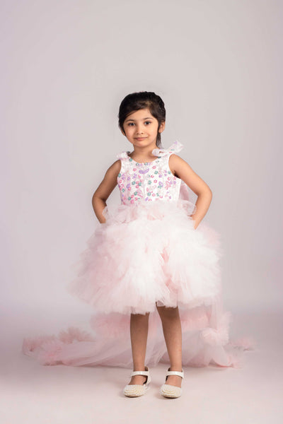 This light pink Princess Blossom dress features delicate colorful sequin work paired with elegant white katdana embellishments, creating a charming and refined look. Designed with a graceful trail at the back, it is perfect for baby girls to wear at special occasions and parties, combining comfort with a sophisticated style.