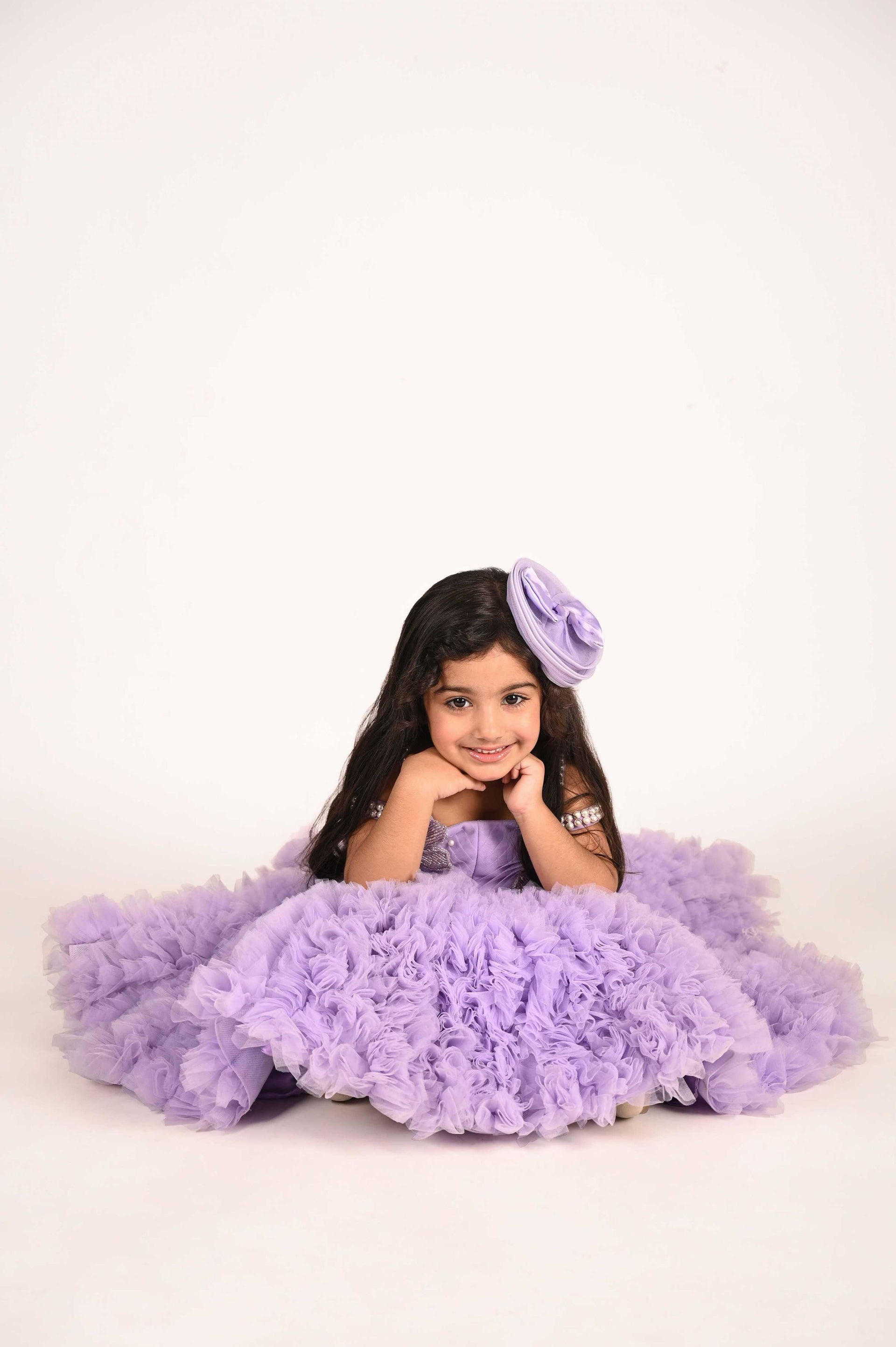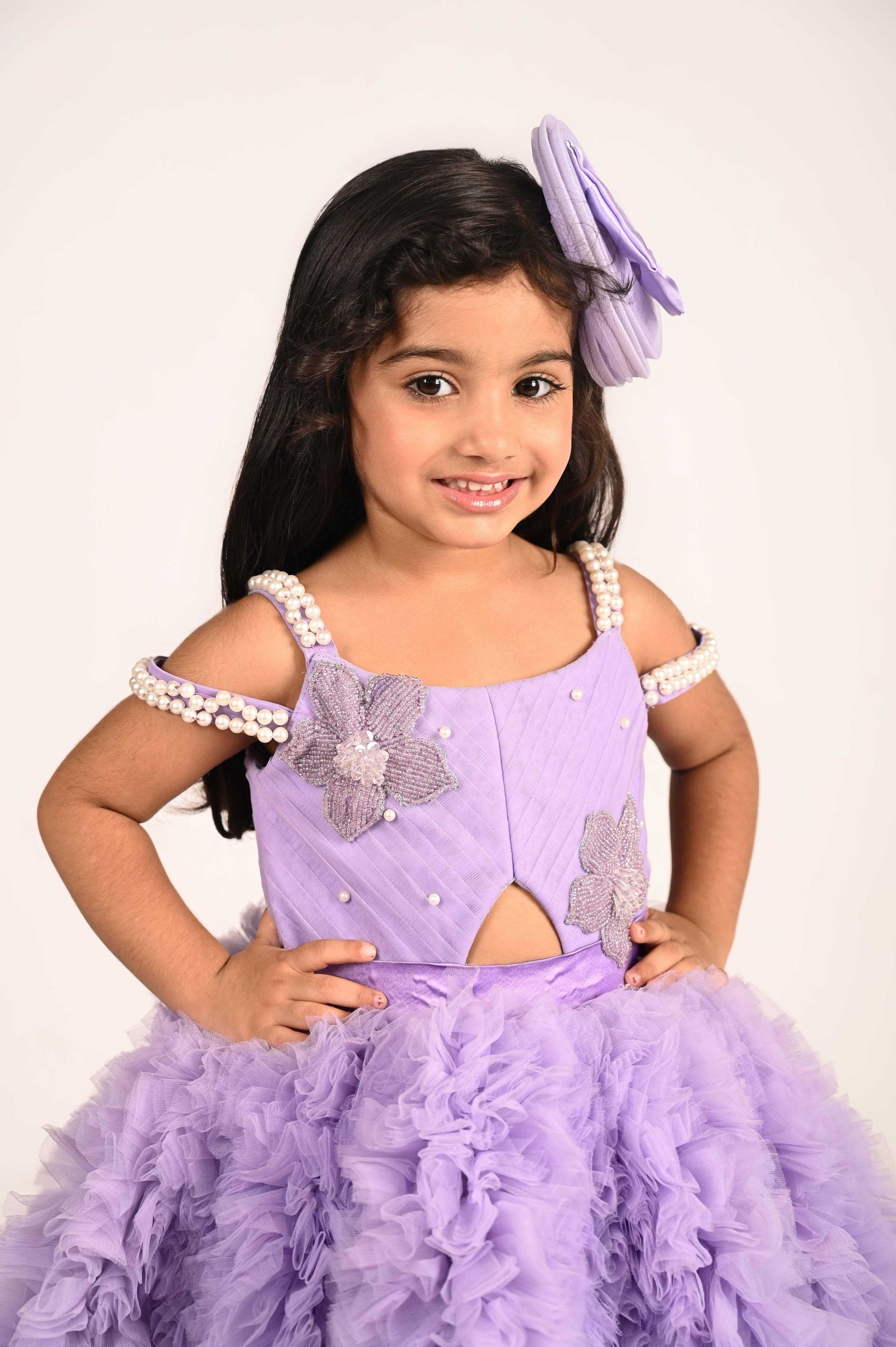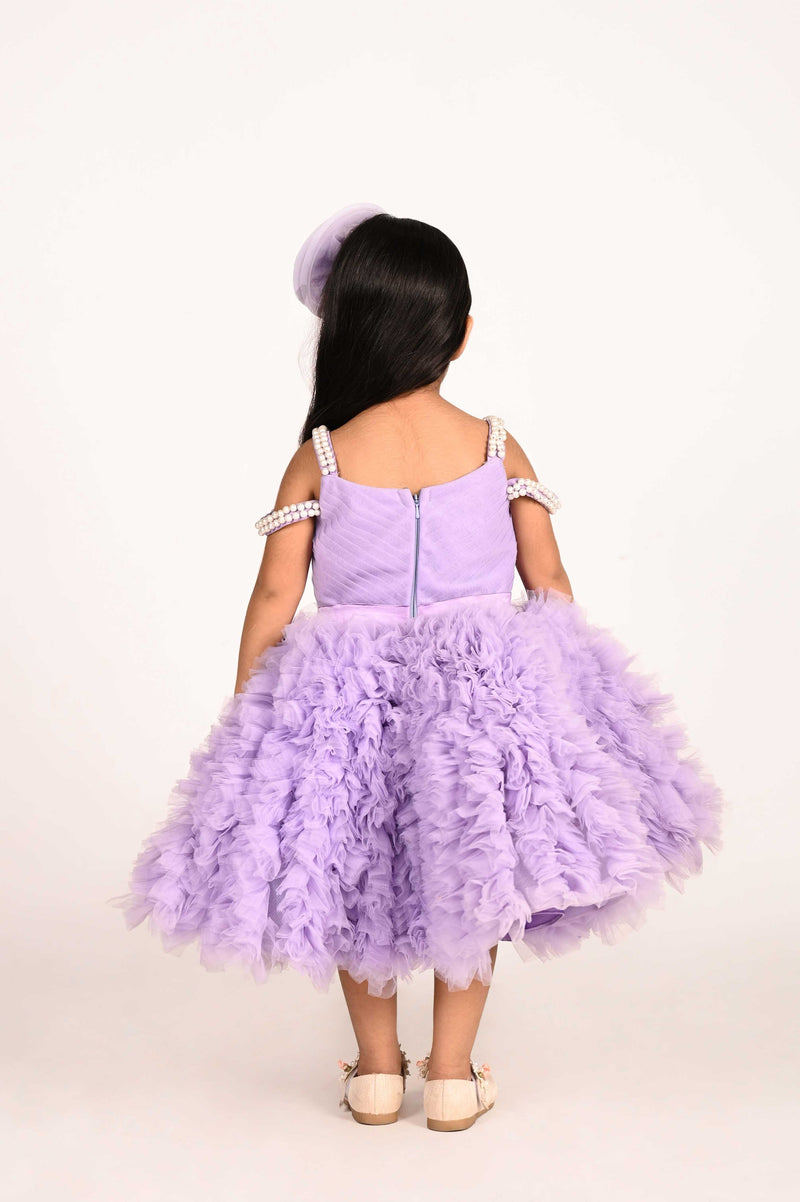 This elegant lavender frill dress features delicate moti work on the straps, adding a refined touch of craftsmanship. Paired with matching head accessories, it creates an enchanting fairy-inspired look perfect for special occasions. Its graceful design combines softness and sophistication, making it a charming choice for young style enthusiasts.