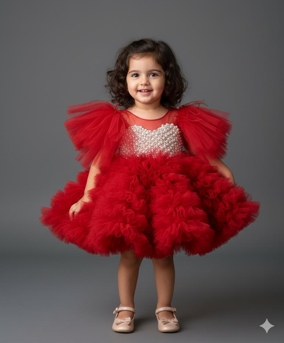 • Material: The dress is made with multiple layers of red tulle fabric, creating a voluminous and dramatic effect.
